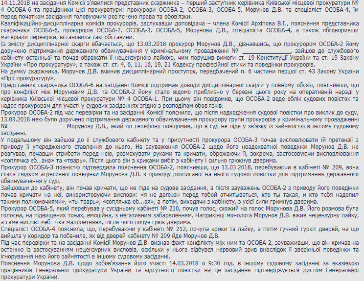 На днях на рассмотрение Квалификационной комиссии прокуратуры снова попал вопиющий случай с участием другого прокурора из той же прокуратуры Днепровского района Киева. На этот раз предметом разбирательств стало поведение одного из старожилов прокуратуры - Дмитрия Морунова, который служит в прокуратуре с 1998 года. А именно то, что он в присутствии коллег обругал младшую коллегу по работе площадной бранью с использованием таких слов как "соплячка е@ная и тварь".