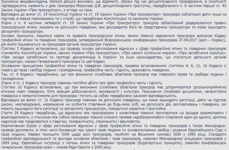Судя из решения КДКП которое есть в открытом доступе на сайте конфликт на работе произошел из-за того, что на прокурор Морунов...не захотел идти в суд. То есть выполнять свои прямые обязанности прокурора. Судя из текста решения КДКП, сотрудница Киевской местной прокуратуры N4, которая отвечает за этот участок работы, расписала судебную повестку на Морунова. Казалось бы чего тут необычного и скандального, ведь поддерживать обвинение это конституционная функция прокуратуры. Однако по версии Морунова, у него в тот же день и то же время было другое судебное заседание, в котором он должен был участвовать по поручению Генеральной прокуратуры.