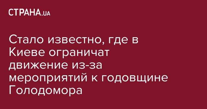 В Киеве из-за мероприятий по случаю 85-й годовщины Голодомора с 20:00 пятницы, 23 ноября, и в течение субботы, 24 ноября, возможны ограничения движения. Об этом со ссылкой на Управление госохраны сообщила пресс-служба КГГА.