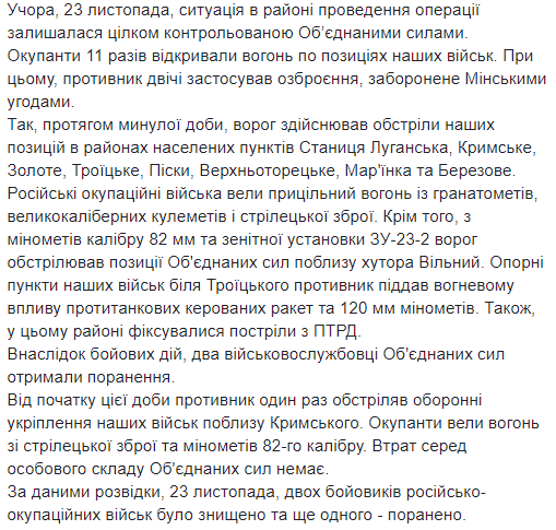 Сообщается, что сепаратисты вели прицельный огонь из гранатометов, крупнокалиберных пулеметов и стрелкового оружия. Кроме того, из минометов калибра 82 мм и зенитной установки ЗУ-23-2 враг обстреливал позиции Объединенных сил вблизи хутора Вольный. Опорные пункты ВСУ возле Троицкого противник обстреливал противотанковыми управляемыми ракетами и из 120-мм минометов, также в этом районе зафиксировано выстрелы из ПТРД.