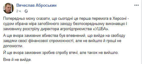 В свою очередь, заместитель руководителя Национальной полиции Украины Вячеслав Аброськин на своей странице в Facebook отметил, что заказчик покушения вчера, 23 ноября, предпринял попытку сбежать, однако это у него не вышло. Как и не вышло выйти на свободу, используя свое материальное положение.