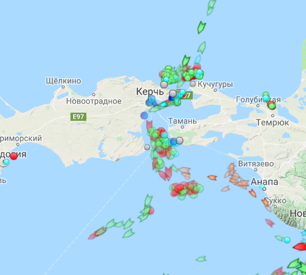 Тем временем международный ресурс Marinetraffic.com показал карту-схему, на которой видно, что сейчас творится в зоне Керченского моста.