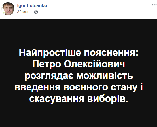 "Самое простое объяснение: Петр Алексеевич рассматривает возможность введения военного положения и отмены выборов", - написал в Facebook нардеп Игорь Луценко.