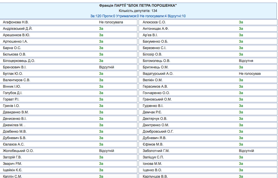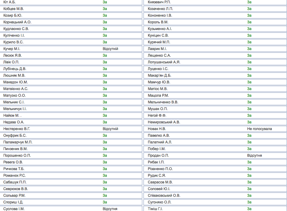 Практически единогласно "за", за исключением нескольких отсутствовавших, проголосовали Блок Петра Порошенко, Народный фронт, Самопомощь и Радикальная партия.