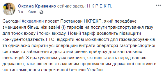 "Сегодня одобрили проект постановления НКРЭКУ, который предусматривает уменьшение более чем вдвое тарифов на услуги транспортировки газа для точек входа и точек выхода. Новый тариф позволит повысить конкурентоспособность ГТС, открыть новые возможности для газодобытчиков и одновременно покрыть все операционные расходы оператора газотранспортной системы и обеспечить достаточный уровень прибыли для капитальных инвестиций", – написала она.