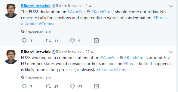 По его словам, в документе нет конкретных призывов к новым санкциям против России. Ранее Йозвяк отмечает, что примерно 6-7 стран Евросоюза рассматривают введение новых санкций против Кремля из-за ситуации в Керченском проливе. Однако даже если они решатся на введение штрафных мер, то сам процесс растянется на длительное время.