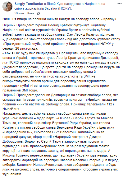 Первый президент Украины Леонид Кравчук подписал "Декларацию в защиту свободы слова". Об этом сообщил глава НСЖУ Сергей Томиленко на своей странице в Facebook.