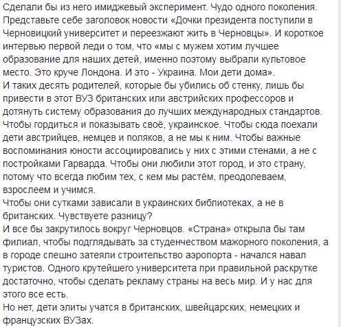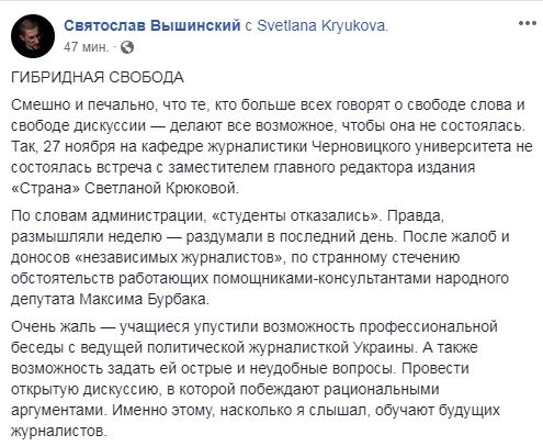 На кафедре журналистики Черновицкого университета 27 ноября не состоялась встреча студентов с заместителем главного редактора интернет-газеты "Страна" Светланой Крюковой. Об этом публицист Святослав Вышинский сообщил на своей странице в Facebook.