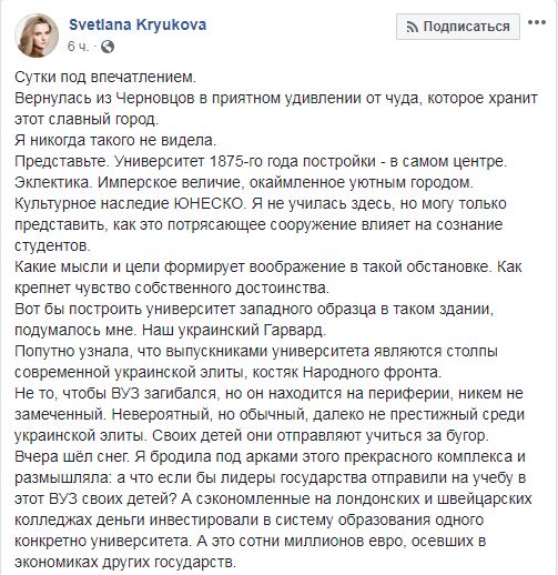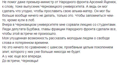 Светлана Крюкова также подтвердила эту информацию. "Вчера в Черновицком университете мне сорвали лекцию со студентами. Люди депутата Бурбака, главы фракции Народного фронта сделали все, чтобы этой встречи не произошло", - написала в Facebook Крюкова.