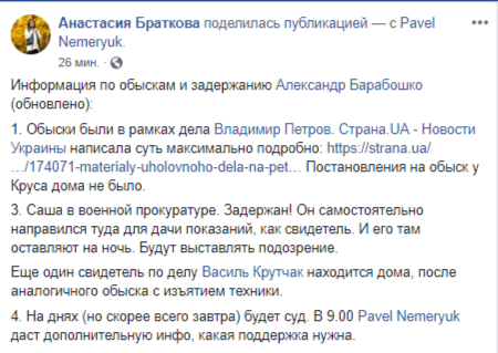 "Саша (Александр Барабошко - Прим. ред.) в военной прокуратуре Задержан! Он самостоятельно направился туда для дачи показаний, как свидетель. И его там оставляют на ночь. Будут выставлять подозрение", - написала она.