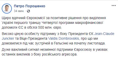 Президент Украины Петр Порошенко сообщил, что Европейская комиссия приняла положительное решение о выделении Украине первого транша четвертой программы макрофинансовой помощи ЕС в объеме 500 млн евро. Об этом Порошенко написал на своей странице в Facebook в пятницу днем.