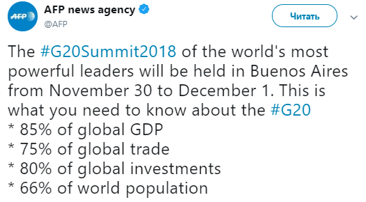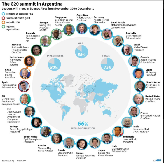 Также на саммите впервые с иностранным визитом после убийства Дж.Хашогги на публике появился наследный принц Саудовской Аравии Мухаммед бен Салман. Кроме того, Канада, США и Мексика в пятницу после продолжительных переговоров подписали соглашение USMCA, призванное заменить NAFTA. Также внимание СМИ привлекает ситуация вокруг Керченского пролива.