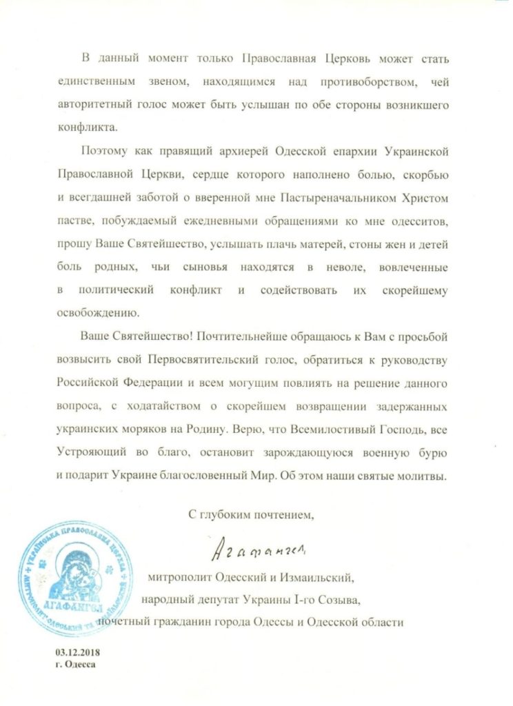 Митрополит Одесский и Измаильский Агафангел призвал Предстоятеля Русской Православной Церкви Святейшего Патриарха Московская и всея Руси Кирилла помочь скорейшему возвращению в Украину моряков, которые были задержаны в результате Керченского инцидента.