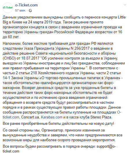 "Такое решение принято организатором концерта в связи с введением ограничения проезда на территорию Украины граждан Российской Федерации возрастом от 16 до 60 лет", - пояснили организаторы.