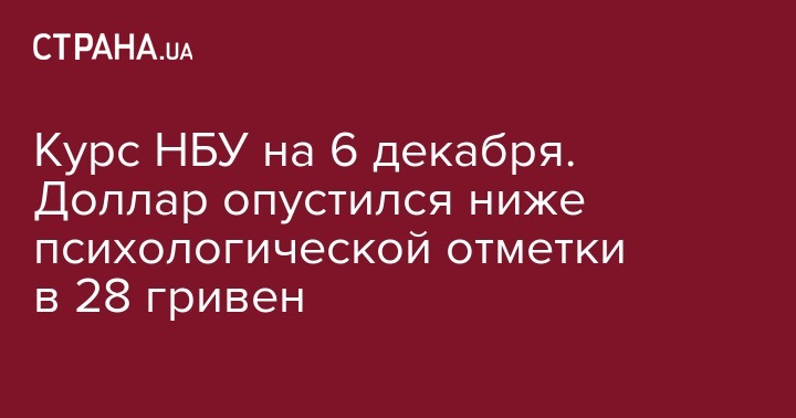 Нацбанк Украины на четверг, 6 декабря, установил официальный курс на уровне 27,98 грн/доллар, что на 15 копеек ниже по сравнению с предыдущим банковским днем. Об этом свидетельствуют данные на сайте регулятора.