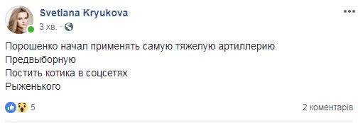 Другие же блогеры отметили, что Порошенко применил тяжелую артиллерию в предвыборной кампании. "Порошенко начал применять самую тяжелую артиллерию. Предвыборную. Постить котика в соцсетях. Рыженького", - написала на своей странице замглавреда "Страны" Светлана Крюкова.