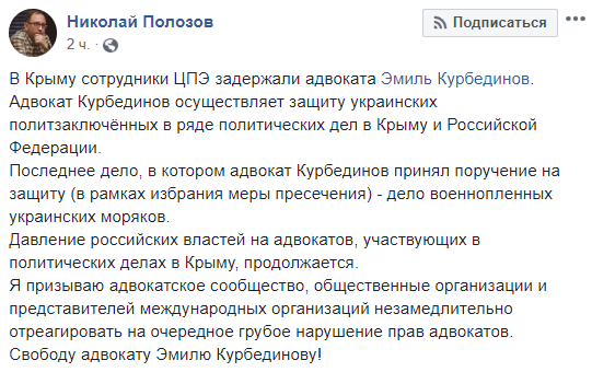 Полозов добавил, что давление российских властей на адвокатов, участвующих в политических делах в Крыму, продолжается. "Я призываю адвокатское сообщество, общественные организации и представителей международных организаций немедленно отреагировать на очередное грубое нарушение прав адвокатов. Свободу адвокату Эмилю Курбединову!", - написал Полозов.