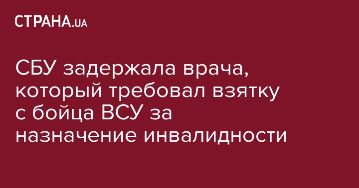 Сотрудники СБУ задержали хирурга в Винницкой области за вымогательство. Он требовал у демобилизированного бойца АТО взятку в $1 300 долларов за назначение инвалидности, сообщили в СБУ.