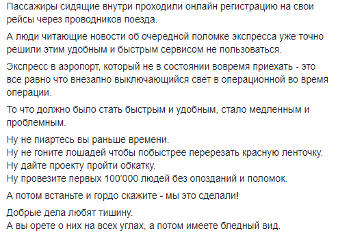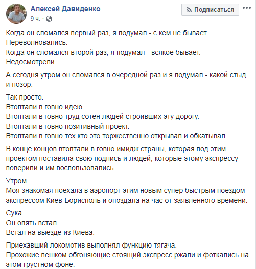 "Моя знакомая поехала в аэропорт этим новым супер быстрым поездом-экспрессом Киев-Борисполь и опоздала на час от заявленного времени. Он опять встал. Встал на выезде из Киева. Приехавший локомотив выполнял функцию тягача. Прохожие пешком обгоняющие стоящий экспресс ржали и фоткались на этом грустном фоне. Пассажиры сидящие внутри проходили онлайн-регистрацию на свои рейсы через проводников поезда", - добавил Давиденко.