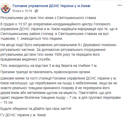 Происшествие случилось 8 декабря около 15:00 в Святошинском районе столицы, в Святошинском пруде на ул. Ушакова, 1.
