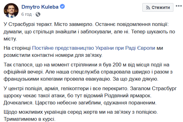 Постоянный представитель Украины при Совете Европы Дмитрий Кулеба был совсем рядом с эпицентром трагедии в Страсбурге, где 29-летний Шериф Шека устроил стрельбу на Рождественской ярмарке. Об этом наш дипломат написал в Facebook.