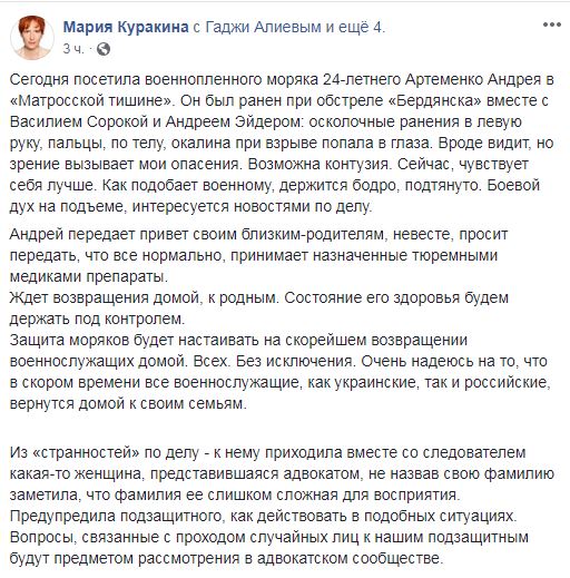 Адвокат Куракина сообщает также о посещении моряка Андрея Артеменко. "К нему приходила вместе со следователем какая-то женщина, представившаяся адвокатом, не назвав свою фамилию. Заметила, что фамилия ее слишком сложная для восприятия", – пишет Куракина в Facebook. Она отмечает, что предупредила своего подзащитного, как действовать в подобных ситуациях.
