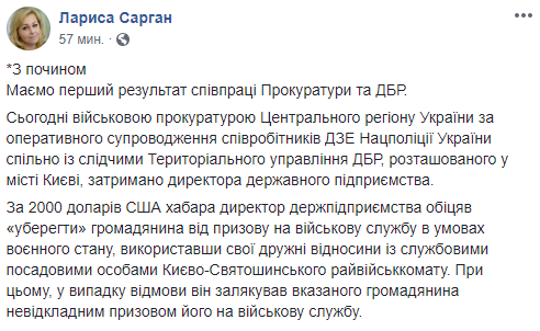 Отмечается, что факт получения неправомерной выгоды задокументирован под процессуальным руководством военной прокуратуры Центрального региона Украины и в сопровождении сотрудников Департамента защиты экономики Нацполиции. Пресс-секретарь генерального прокурора Лариса Сарган указывает, что это первый результат сотрудничества прокуратуры и ГБР. По данным прокуратуры, в течение ноября - декабря 2018 года указанное должностное лицо выдвинуло гражданину Украины требование о передаче 2 тысяч долларов США.