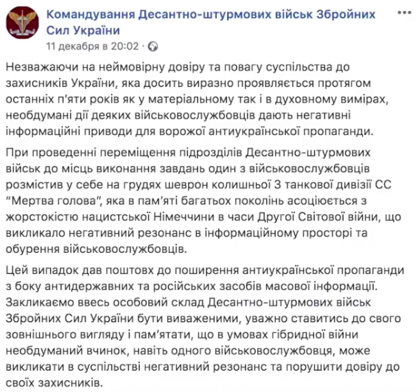 Призываем весь личный состав десантно-штурмовых войск Вооруженных Сил Украины быть взвешенными, внимательно относиться к своему внешнему виду и помнить, что в условиях гибридной войны необдуманный поступок, даже одного военнослужащего, может вызвать в обществе негативный резонанс и нарушить доверие к своим защитникам".