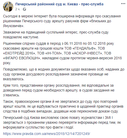 Печерский суд Киева, который в течение месяца отменил аресты по меньшей мере 26 счетов, которые правоохранители связывали с окружением Виктора Януковича, заявил о том, что следствие не доказало причастность этих фирм к экс-президенту. Об этом идет речь в сообщении пресс-службы суда, опубликованном в Facebook.