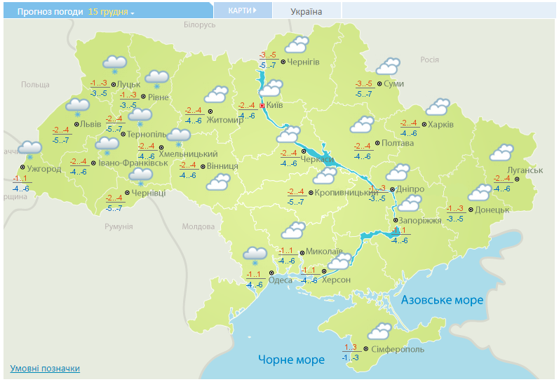 В субботу, 15 декабря, погода в Украине будет пасмурной, но без осадков. Об этом сообщает пресс-служба Укргидрометцентра.