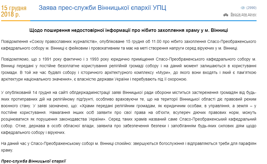Сегодня, 15 декабря, на сайте Винницкой епархии (подконтрольна митрополиту Симеону, который принимает участие в объединительном соборе и претендует на роль главы новой церкви) появилось опровержение захвата Винницкого Свято-Преображенского кафедрального собора УПЦ МП. Тем временем в "Союзе православных журналистов", который распространил эту информацию, утверждают, что на епархию оказали давление, вынудив опубликовать опровержение.