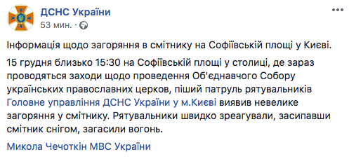 15 декабря около 15:30 на Софиевской площади в столице, во время проведения мероприятий по проведению Объединительного Собора Украинской православных церквей, пеший патруль столичных спасателей обнаружил возгорание мусорника.