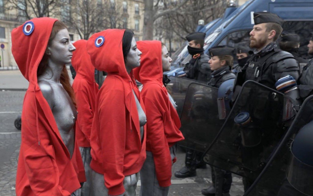 Протестующие были одеты в красные топы с капюшоном, обнажающие грудь. Они стояли перед полицейскими около получаса. Их тела также были покрыты серебристой краской. По словам корреспондента издания, до этого активистки проходили по Елисейским полям. Несмотря на схожесть с акциями движения Femen, протест могла организовать парижская художница Дебора де Робертис.