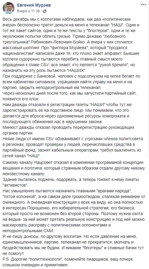 "Давайте разберемся: во-первых Мураев никогда не причислял себя к пророссийским политикам. Во-вторых, Мураева кинули Медведчук и Рабинович, поэтому он имеет полное моральное право негативно о них отзываться. В-третьих, вряд ли он открыл для кого-то секрет, что Медведчук, который, таки да, агент Кремля, активно работает с Порошенко и прекрасно себя чувствует в Украине последние пять лет. И в-четвертых: Мураев идет на выборы и его аудитория пересекается с электоратом Рабиновича/Медведчука, поэтому вполне логично, что он борется за нее, а не, например, упоротых радикалов или фанатов Томоса.