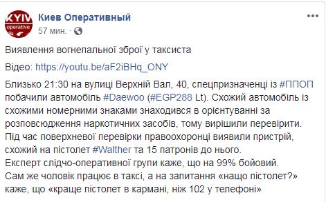 Вечером 19 декабря в Подольском районе Киева полиция задержала таксиста, у которого нашли пистолет Walther (Вальтер) и 15 патронов к нему. Об этом сообщает Киев Оперативный в Facebook.