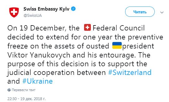 "19 декабря Федеральный Совет принял решение о продлении на один год превентивного замораживания активов сбежавшего украинского президента Виктора Януковича и его окружения", - говорится в сообщении. "Целью этого решения является поддержка судебного сотрудничества между Швейцарией и Украиной", - объясняет дипломатическое ведомство.