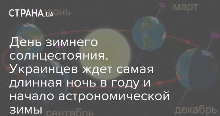 Также наклон оси и удаленность от Солнца влияют на продолжительность дня. В дни осеннего и весеннего равноденствия день равен ночи. Зимой и летом ось приходит в крайнее положение, а затем стремится к противоположному. Во время зимнего солнцестояния, которое в разные годы приходится то на 21, то на 22 декабря, наблюдается самая длинная ночь в году. В этом году астрономы сообщают, что зимнее солнцестояние для украинцев произойдет 21 декабря в 00:23.
