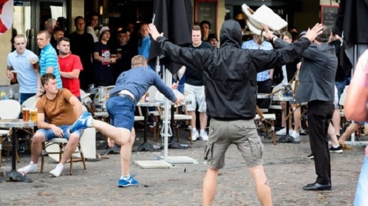 Британские фанаты распевают песни, оскорбляющие Россию, и провоцируют российских фанатов, проходящих мимо, параллельно вызывая их на драку. Россияне в побоища пока не вступают, лишь словесно отвечая на выпады британцев.