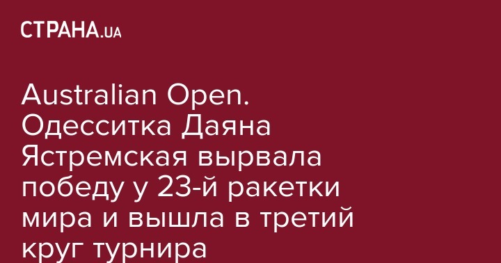 Сегодня, 17 января, после успеха Элины Свитолиной, еще одна украинская теннисистка пробилась в третий круг Открытого чемпионата Австралии - Australian Open. Наша Даяна Ястремская в упорной борьбе вырвала победу у 23-й ракетки мира Карлы Суарес Наварро.