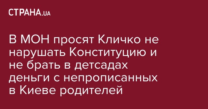 "МОН обратилось к главе КГГА Виталия Кличко с просьбой пересмотреть решение Киевского горсовета, согласно которому родители незарегистрированных в столице детей должны оплачивать их обучение в коммунальных детсадах Киева. Соответствующее письмо за подписью министра Лилии Гриневич был направлен сегодня, 18 января 2019 года", - говорится в сообщении.