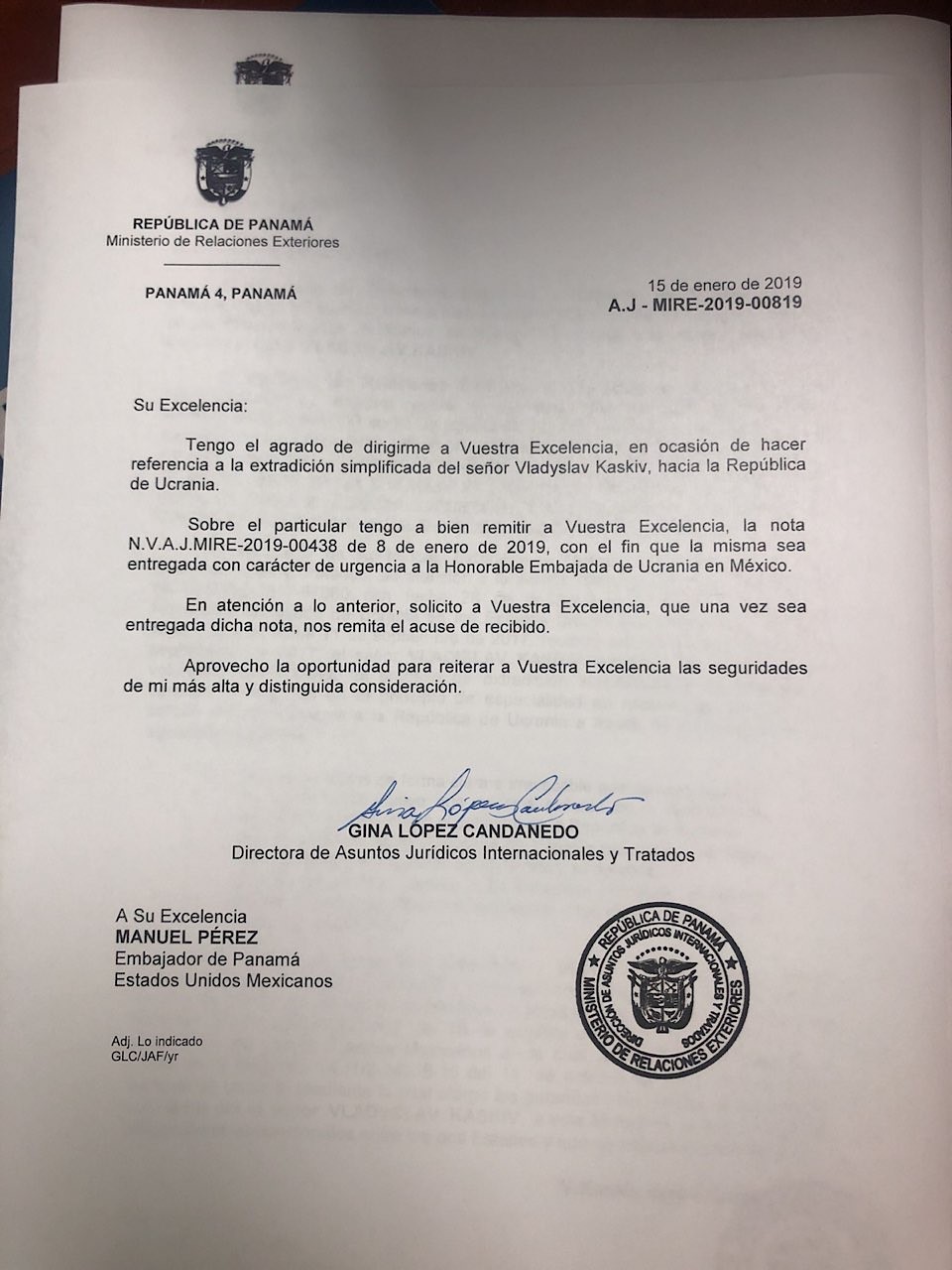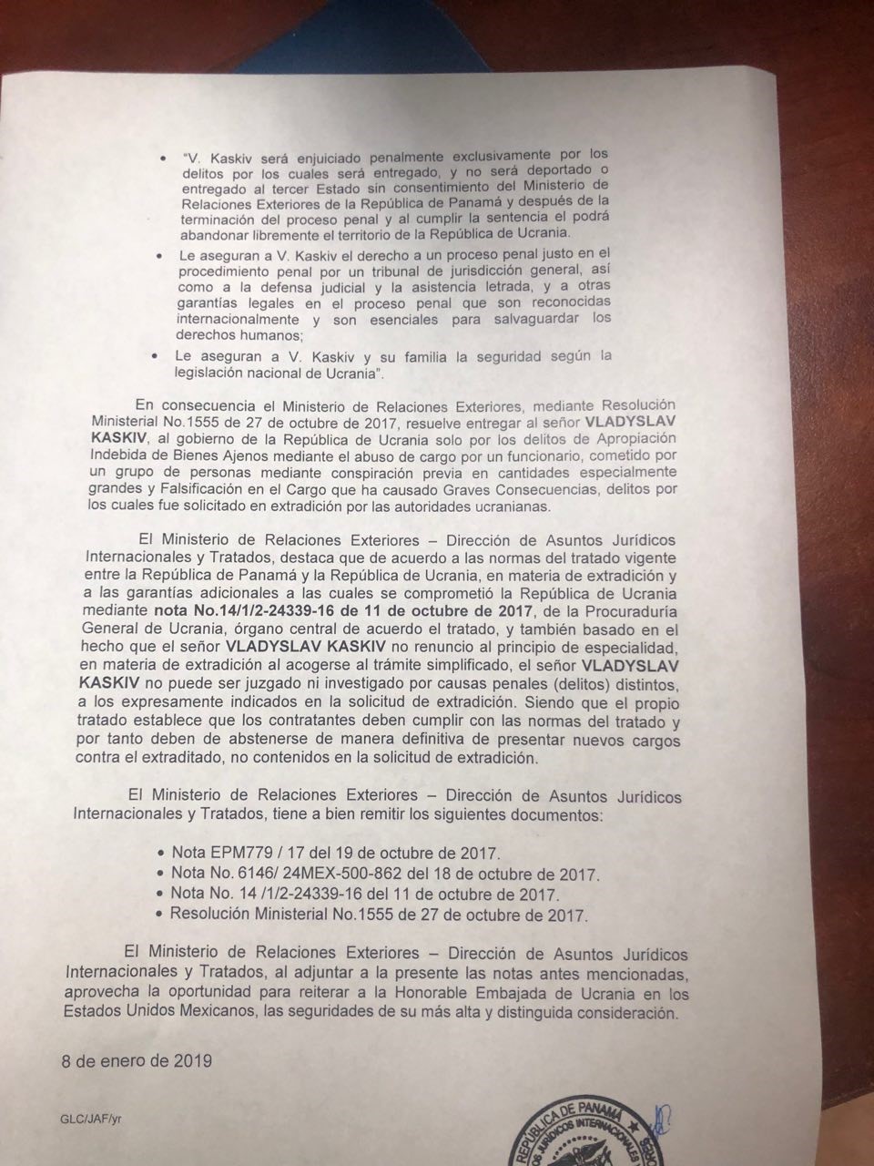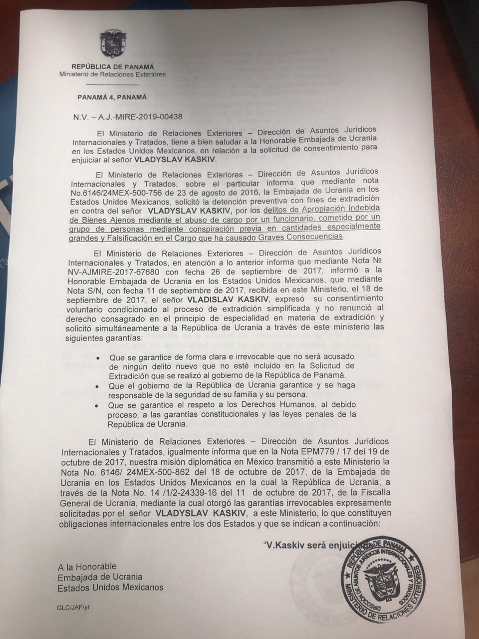В письме Министерства иностранных дел Панамы указано что: "господин Владислав Каськив не может быть осужден или обвиняемый за уголовные дела (преступления), отличные от тех, которые были прямо указаны в запросе об экстрадиции".