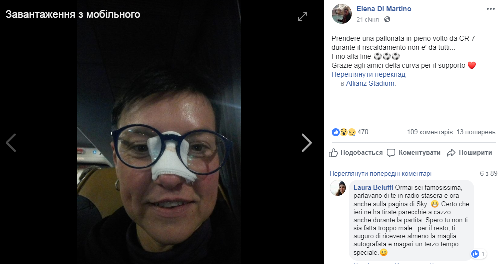 "Получить удар в анфас от CR7 во время разминки - это не для всех... Благодарю друзей за поддержку", - написала итальянка.