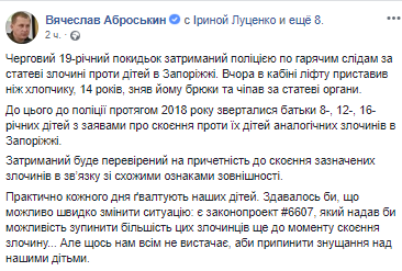"Очередной 19-летний подонок задержан полицией по горячим следам за половые преступления против детей в Запорожье. Вчера в кабине лифта приставил нож мальчику, 14 лет, снял ему брюки и трогал за половые органы", - рассказал Аброськин.