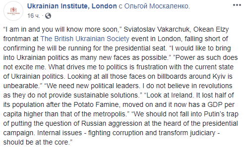 "Я в деле и вы узнаете больше в ближайшее время. Я хотел бы привести в украинскую политику как можно больше новых лиц. Власть как таковая меня не интересует", - в институте утверждают, что именно так Вакарчук ответил на вопрос, будет баллотироваться на выборах президента Украина в 2019 году.