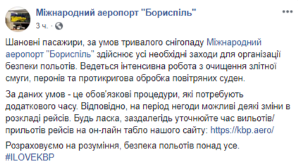 "Уважаемые пассажиры, в условиях длительного снегопада Международный аэропорт "Борисполь" осуществляет все необходимые меры для организации безопасности полетов. Ведется интенсивная работа по очистке взлетной полосы, перронов и противоледная обработка воздушных судов. При данных условиях - это обязательные процедуры, требующие дополнительного времени. Соответственно, на период непогоды возможны некоторые изменения в расписании рейсов. Пожалуйста, заранее уточняйте время вылетов/прилетов рейсов в он-лайн табло нашего сайта: https://kbp.aero/ Рассчитываем на понимание, безопасность полетов превыше всего", - сообщили в пресс-службе аэропорта в среду вечером на странице в соцсети Facebook.