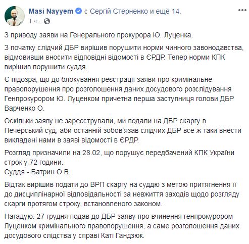 Адвокат Маси Найем будет жаловаться на судью Олесю Батрин, которая не обязала Государственное бюро расследований (ГБР) открыть дело на генпрокурора Юрия Луценко за якобы разглашение данных досудебного следствия по делу об убийстве активистки Екатерины Гандзюк. Об этом 25 января Найем написал в Facebook.