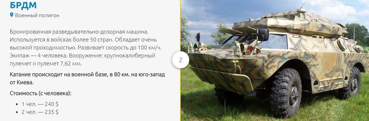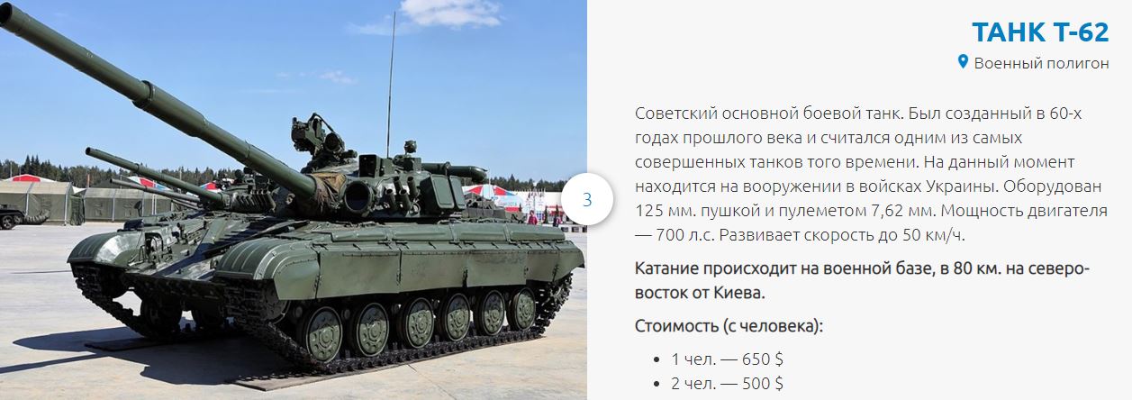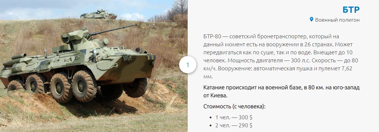 Отмечается, что в наличии есть две машины: БТР-80 ($300 с человека) и БРДМ-2 ($240 с человека). Также можно покататься на танках Т-62/Т-64 за $650. В стоимость входит: трансфер из отеля на военный полигон и обратно, катание на выбранных боевых машинах, мастер-класс по управлению боевой машиной, напитки (вода, соки или пиво), а также сувениры и обед (полевая кухня или обед в ресторане украинской кухни).