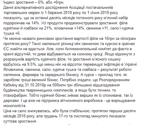 Также Алексей Дорошенко приводит данные касаемо стоимости килограмма каждого из продуктов по состоянию на декабрь 2017 и декабрь 2018 года. Куриное филе подорожало на 16 грн - до 105 грн, говядина прибавила в цене 14 грн и стала стоить 128 грн, вареная колбаса теперь стоит на 10 гривен дороже - 93 грн, сало подорожало на 7 грн и стоит теперь 76 грн, куриная тушка подорожала всего на 4 грн и стоит 58 грн, а свинина прибавила в цене 6 грн и стоит 115 грн.