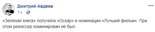 "Возможно, скажу сейчас как Шариков — "Не согласен я", — но я не согласен. Не согласна с американской киноакадемией, отдавшей "Оскар" фильму "Зеленая книга" как лучшему. Как по мне, хорошая добротная картина, но когда смотришь, то возникает ощущение, что где-то уже что-то такое было. Мне по основной мысли и вообще по эмоциям напомнил "Один плюс один" — душевный такой фильм о том, как двое людей из разных "слоев" становятся лучшими друзьями. Только "Один плюс один" всё равно лучше. Зато рада за Рами Малека и его "Оскар". Вот прям очень".