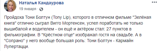 Пройдоха Тони Болтун (Tony Lip), которого в отличном фильме "Зелёная книга" отлично сыграл Вигго Мортенсен, успел поработать не только вышибалой и водителем - он ещё и актёром стал: 27 пунктов в фильмографии. В "Крёстном отце" изображал гостя на свадьбе. А в "Сопрано" у него вообще большая роль: Тони Болтун - Кармайн Лупертацци.